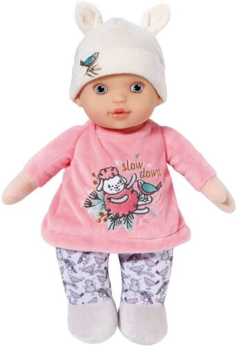 Das rosa Oberteil ist mit verspielten Stickereien verziert. Der slow-down-Schriftzug erinnert auch die Eltern daran, einfach mal langsam zu machen. Der liebevoll modellierte Kopf der Stoffpuppe ist aus softem Vinyl und mit freundlich schauenden Augen bemalt.
