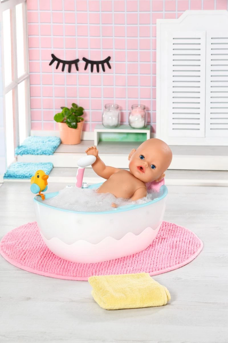 Der Duschknopf aktiviert die weiß-rosa Brause. Ist die Badewanne dabei leer, sind Plätschern und typische Wassergeräusche zu hören. Wurde vorher Wasser hineingefüllt, läuft es nun durch den Duschkopf. Dieser kann in Richtung Wanne geneigt werden, damit kein Tropfen daneben geht. Der Schlauch kann aber auch herausgezogen werden, um BABY born gründlich abzuduschen oder dem Brother noch eine weitere Ladung Wasser zu verpassen. Hochwertiges Zubehör für die BABY born Markenspielpuppe. Für erweitertes, abwechslungsreiches und langanhaltendes Spielvergnügen. Für Puppen in 36cm und 43cm geeignet. Batterien erforderlich (nicht im Lieferumfang enthalten). BABY born Bath Badewanne mit Licht- und Sound-Effekten. Inklusive Kissen und Spritz-Ente.