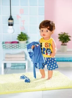 ‚ Ja, genau die Beine wie ein Frosch “ Der Brother bringt BABY born das Schwimmen bei. Er ist nämlich der beste Bruder der Welt best Bro, so steht es auch auf seinem gelben Shirt. Die blauen Badeshorts sind mit ganz vielen Bertas im Enten-Rettungsring bedruckt.