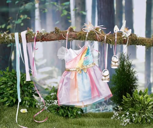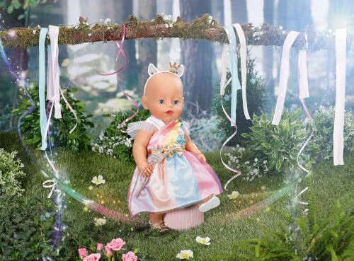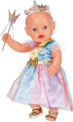 Das ist meeeiiin Zauberstaaab!- „Nein, das ist mein Zepter! BABY born und die Sister streiten sich gerade um das gekrönte Accessoire am Stiel. Bei BABY born geht noch alles um Feenstaub und wünsch-dir-was. Die Sister hat schon ihren eigenen Kopf und möchte, dass alle nach ihrer Pfeife tanzen. Tanzen mögen eigentlich beide sehr gerne. Im Prinzessinnenkleid mit Regenbogenfarben dreht es sich auch besonders gut. Der Überrock aus Tüll glitzert dabei ganz zauberhaft. Durch den asymetrischen Schnitt sieht es so aus, als ob die Trägerin eine Schärpe trägt. Die goldenen Sandalen harmonieren bestens mit der Schleife um den Bauch. Ob Dickschädel oder nicht, ein Haarreif mit Einhorn, Krone, putzigen Öhrchen und entnehmbaren Pins muss einfach sein. Hochwertige Kleidung für die BABY born Markenspielpuppe. Für erweitertes, abwechslungsreiches und langanhaltendes Spielvergnügen. Kinderleichtes An- und Ausziehen. BABY born Fantasy Deluxe Prinzessin 43cm aus Kleid und Schuhen. Inkl. Haarreif mit Pins und Zepter.