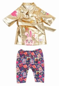 Wir würden BABY born mit ihren 30 Puppenjährchen noch nicht als Golden Girl bezeichnen, aber in diesem Outfit passt das einfach. Zu ihrem Geburtstag präsentiert sich die kleine Trendsetterin in einem goldenen Trenchcoat. Trench ist schließlich Trend. Dazu trägt sie eine bunte Hose mit Cosmic-Comic-Print. Das auffällige Muster nennt sich cartoon to the moon. Hochwertige Kleidung für die BABY born Markenspielpuppe. Für erweitertes, abwechslungsreiches und langanhaltendes Spielvergnügen. Kinderleichtes An- und Ausziehen. BABY born Happy Birthday Mantel 43cm aus Jacke und Hose. Inkl. Kleiderbügel.