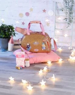 BABY born und ihre Geburtstagsgäste machen einen Ausflug auf den Indoor-Spielplatz. Da gibt es nämlich einen Weltraum-Park. Das Astronauten-Thema steht bei den Kleinen gerade hoch im Kurs. Falls auf der Umlaufbahn mal was ins Höschen geht, ist die goldene Wickeltasche im spacigen Design immer mit dabei. Darin enthalten sind eine Wickelunterlage mit Astronauten-Hase Benno, ein Puderdöschen und eine Ersatzwindel. Und wenn BABY born etwas länger am Mondlift anstehen muss, kann sie sich so lange mit dem Spielring beschäftigen. Hochwertiges Zubehör für die BABY born Markenspielpuppe. Für erweitertes, abwechslungsreiches und langanhaltendes Spielvergnügen. Auch für kleinere Puppen geeignet. BABY born Happy Birthday Wickeltasche mit Wickelunterlage, Windel, Puderdose und Spielring.