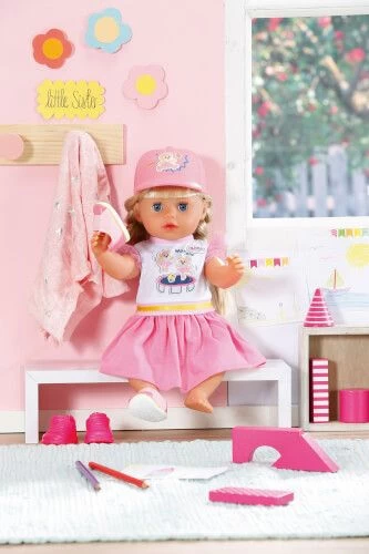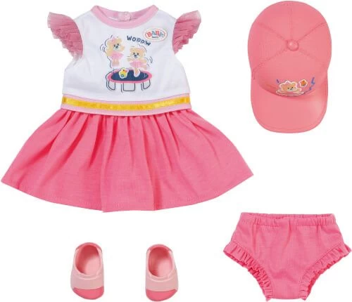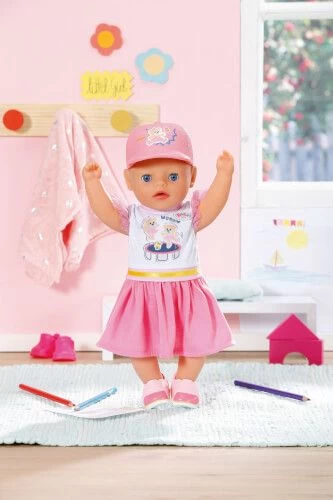 Auch im Kindergarten wird Sport gemacht, mit diesem hĂĽbschen Outfit sind die BABY born Little Puppen perfekt dafĂĽr ausgestattet. Das Set beinhaltet Kleid mit Aufdruck, Unterhose, Sneaker und eine coole Cap.