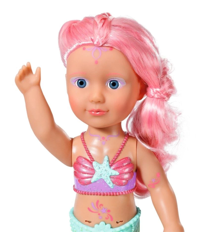 Das Oberteil im Muscheldesign und die bunte Körperbemalung passt farblich hervorragend zum Meerjungfrauenschwanz. In ihren langen pinken Haaren trägt die Meerjungfrau ein lila Diadem. Die Haare lassen sich mit dem Kamm immer wieder zu neuen Frisuren stylen. BABY born Little Sister Meerjungfrau. Bewegt sich im Wasser.