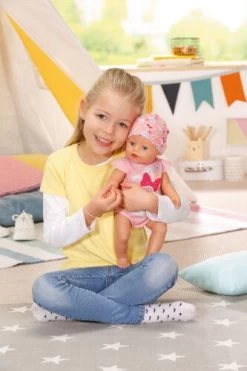 ‚Das Mädchen will einfach nicht verstehen, warum es schon ins Bett muss. Es ist doch noch hell drauĂźen. Mama und Papa haben da jetzt einen tollen Trick: einfach den Schuller im Mund drehen, schon gehen die Augen zu und es ist dunkel. Wenn das mit jedem Baby so einfach wäre Durch Drehen des Schnullers öffnet und schlieĂźt die Puppe die Augen. Egal in welcher Position sich ihr Körper befindet. DarĂĽber hinaus hat das Girl Schlafaugen. Legt man sie ohne Schnuller auf den RĂĽcken, schlieĂźt sie die Augen automatisch. Schlafen, Baden und Essen sind des Girls Lieblingsbeschäftigungen. Sie trinkt gerne Wasser aus ihrem Fläschchen und kann dann Pipi in die Windel oder ins Töpfchen machen und echte Puppentränen weinen. Neben Wasser steht der BABY born Brei auf dem Speiseplan. Dann macht sie sogar ihr groĂźes Geschäft. Ihre Arme, Beine und der Kopf sind super beweglich, so dass das An- und Ausziehen der trendigen Kleidung zum Kinderspiel wird. Der Soft Touch Körper ist angenehm weich. 10 Accessoires, die ihre Funktionen unterstĂĽtzen, ein rosa Body und ein MĂĽtzchen gehören zur Erstausstattung. BABY born Magic Mit 10 lebensechten Funktionen fĂĽr groĂźe Spielfreude. Das abwechslungsreiche (Rollen-)Spiel mit BABY born fördert die Fantasie und unterstĂĽtzt nachweislich die Entwicklung sozialer Fähigkeiten und Werte wie Verantwortung, Kommunikation und EinfĂĽhlungsvermögen. Der Schnuller passt jeder BABY born Puppe in 43cm. Die Augen-Funktion des Schnullers geht nur in Verbindung mit BABY born Magic. Benötigt keine Batterien. BABY born Magic Girl 43cm mit Body und MĂĽtze. Inklusive 1 Töpfchen, 1 Windel, 1 Teller mit Löffel, 1 Portion Brei, 1 Flasche, 1 magischer Schnuller, 1 Geburtspass und je 1 Freundschaftsbändchen fĂĽr Kind und Puppe.“