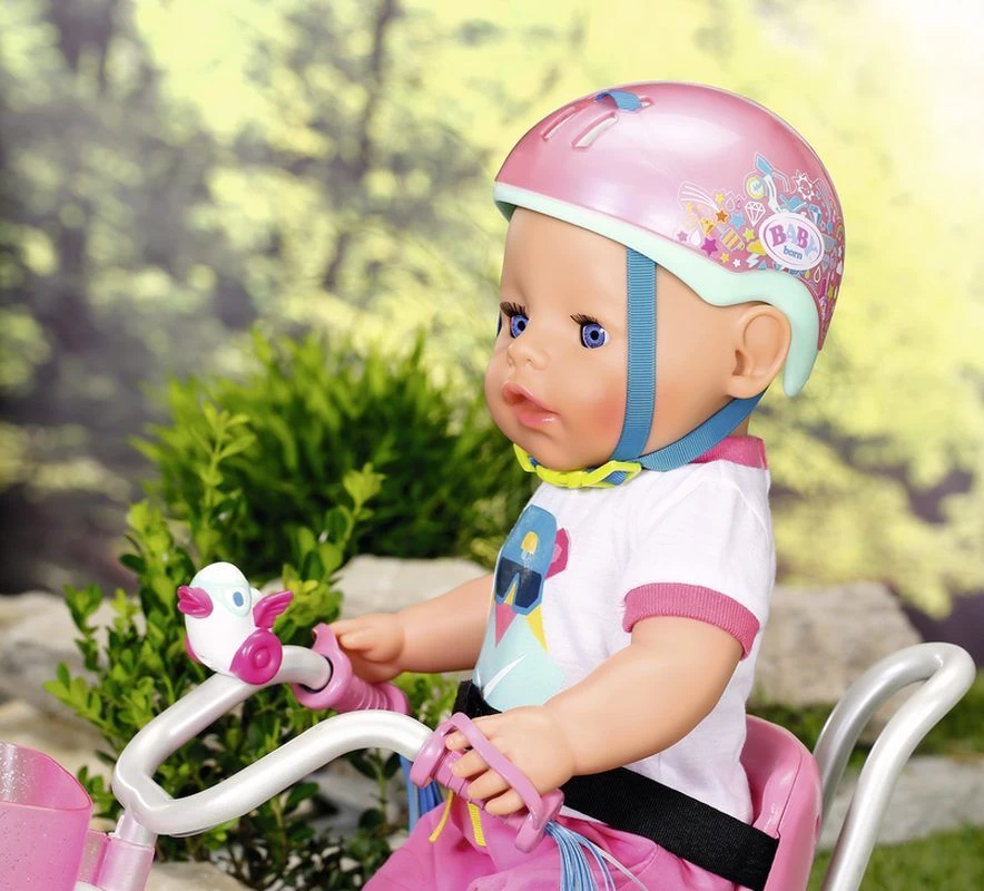 BABY born trägt immer ihren Fahrradhelm, denn Sicherheit ist wichtig. Egal, ob sie selbst mit ihrem Fahrrad unterwegs ist oder im Fahrradsitz mit jemand anderem mitfährt. Die Kopfbedeckung in rosa mit türkisen Schließriemen ist auch besonders stylisch. Auf der Seite finden sich verschiedene Symbole in allen Farben des Regenbogens. All diese Dinge hat BABY born schon mal während einer Radtour gesehen.