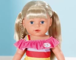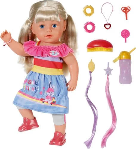 BABY born Sister ist ein bisschen älter als BABY born, aber genauso groß, deshalb können die beiden prima Klamotten tauschen. Sie hat wunderbar langes Haar, das man toll kämmen und frisieren kann. BABY born Sister blond mit lebensechten Funktionen, die alle ohne Batterien funktionieren, ist durch ihren weichen und mobileren Körper nun noch einfacher zu bespielen und bietet ein realistisches Eltern Kind Rollenspiel. NEU: 2 Haarclips mit farbigen Strähnen und coole Haar Tattoos.