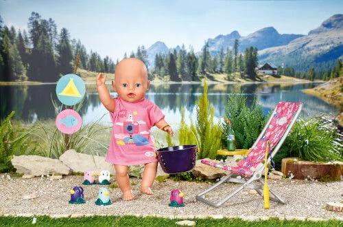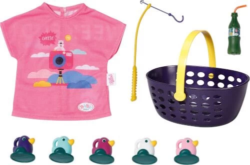 „Fischers Fritze fischt frische Fische… Ach, nein, BABY born angelt putzige Entlein. Während sie bequem im rosa Liegestuhl mit buntem Muster sitzt, versucht sie mit dem Haken der Angel eine der fĂĽnf Enten einzufangen. Hin und wieder nippt sie an der Limonade, die auf dem gelben Tischchen am Liegestuhl steht. Wenn alle Entlein geangelt sind und sich im blauen Körbchen tummeln, dĂĽrfe sie wieder in den Teich und das Spiel geht von vorne los. Zu diesem lustigen Angelspiel trägt BABY born ein lässiges rosa Longshirt mit coolem Druck.Â