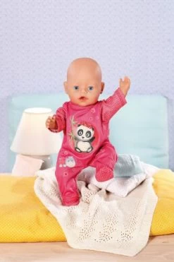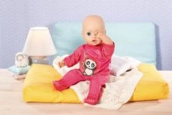 Hier haben wir keinen „kleinen ROTEN Panda, sondern einen „kleinen ROSA Panda. Die Tierchen scheinen vom Thema Kleidertausch auch ganz begeistert zu sein. Dank des lässigen Schnitts können BABY born, Baby Annabell und andere Puppen in einer Größe von 39-46 cm fröhlich die Kleidung hin und her tauschen. In der Mitte des bequemen rosa Stramplers ist eine Panda-Dame appliziert, die sich ihr nächstes Mahl zubereitet.