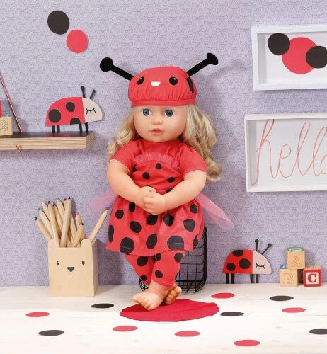 Mit Dolly Moda ist jede Puppe glücklich. Dank des lässigen Schnitts können BABY born, Baby Annabell und andere Puppen in einer Größe von 39- 46 cm fröhlich die Kleidung hin und her tauschen. Das süße Glücksbringer-Kleidchen und die Hose sind mit den typischen schwarzen Marienkäfer-Punkten verziert. Am Oberteil befinden sich Tüllstreifen wie kleine Flügelchen. Und beim Anblick der Mütze mit Käfer-Gesicht und Fühlern bekommt man automatisch einen glücklichen Gesichtsausdruck. Original Zapf Creation Kleidung für die Markenspielpuppen BABY born, Baby Annabell und andere Puppen in einer Größe von 39-46 cm. Für Puppen in einer Größe von 39-46 cm. Erweitert die Spielmöglichkeiten, regt die Fantasie an und fördert kreatives Rollenspiel. Dolly Moda Süßes Marienkäfer Outfit 43cm aus Kleid, Hose und Mütze.