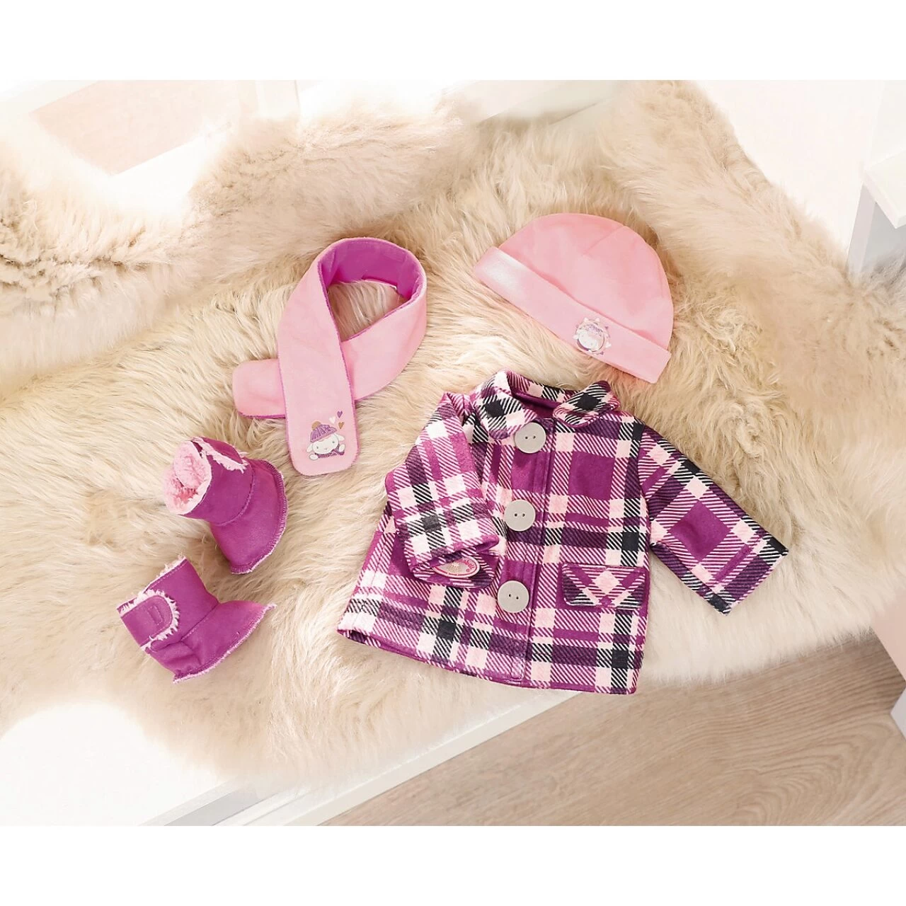 Zum Herbstspaziergang im Stadtpark bekommt Baby Annabell ihren karierten Mantel angezogen. Die kuschelige Jacke mit Karos in allen Größen und Knopf-Applikationen hält die Kleine schön warm und ist super schick. Passend dazu gibt es pinke Fellstiefelchen für warme Füßchen. Für einen geschützten Kopf sorgt die rosa-farbige Mütze. Damit die Spaziergängerin keinen Schnupfen bekommt, gibt es im Mantelset auch einen Schal mit Schäfchen-Druck.
