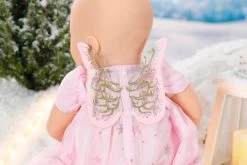 Ihre Heiligkeit trägt ein rosa Kleid mit einer zarten Lage Tüll darüber. Es ist mit Sternchen und Eisblumen bedruckt. Vom Rock grüßt Baby Annabells Lieblingsschaf in Christkind-Look. Ein goldiges Schleifchen ziert den Brustbereich. Passend dazu trägt das kleine Engelchen Flügel und einen goldenen Haarreif mit Heiligenschein aus hellrosa Plüsch.