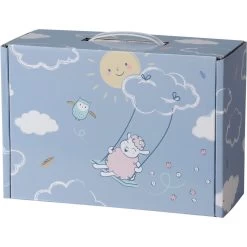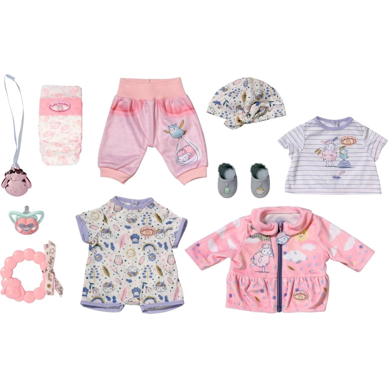 Mit diesem Set ist deine Baby Annabell bestens ausgestattet – Set bestehend aus Hose, T-Shirt, Mütze, Jacke, Strampler, Schuhen, Schnuller, Windel, Beißring und Schäfchen-Anhänger.