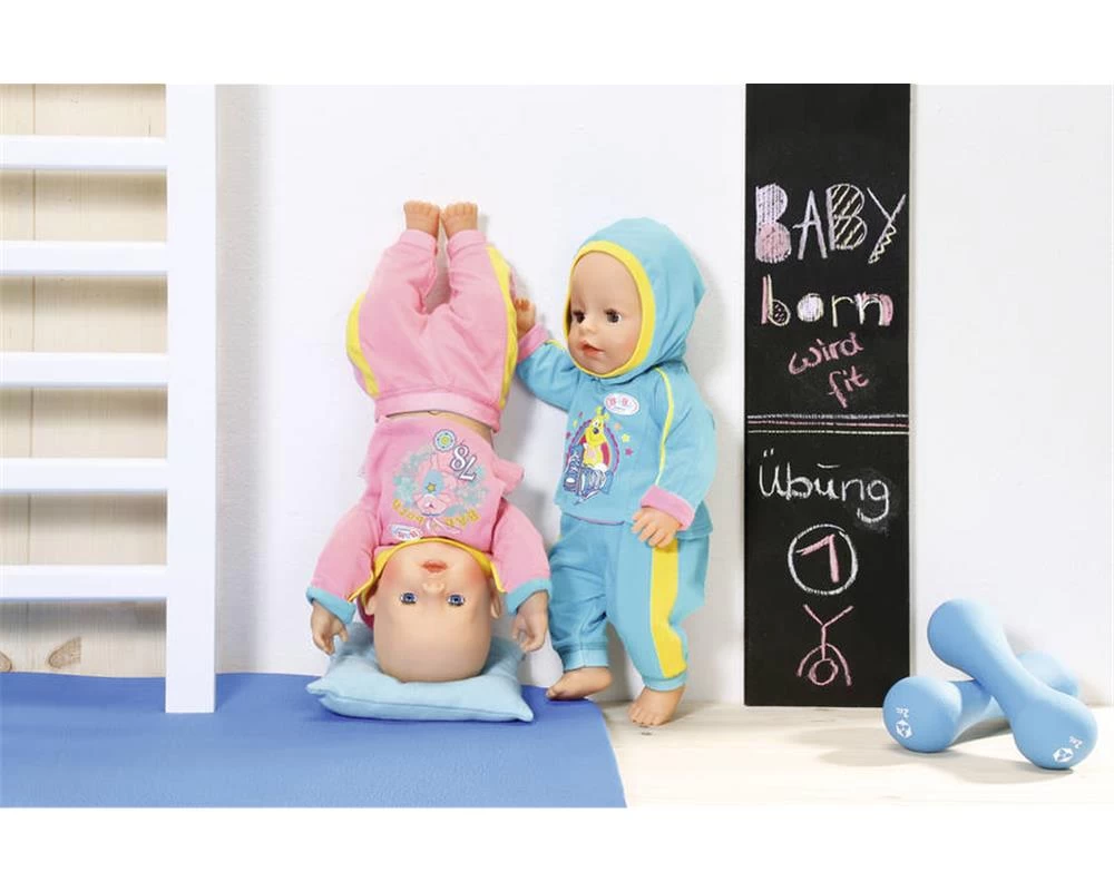 Ein Sprung nach Rechts, ein Sprung nach Links und Hampelmann. Puhhh, Sport kann ganz schön anstrengend sein. Aber BABY born® macht das gar nichts aus, denn ihre Jogginganzüge aus Jogginghose und Hoody bieten super viel Bewegungsfreiheit. Und die BABY born® Sister ist sowieso eine Sportskanone. In Rosa oder Türkis mit graumelierten Ärmeln, witzigen bunten Drucken und Reisverschluss-Applikationen machen sie Rolle vorwärts und rückwärts, Springen über Kästen und balancieren auf Bänken. Die beiden lümmeln aber auch gerne mal bequem auf dem Sofa herum. Egal wie, mit den beiden Jogginganzügen machen sie immer eine gute Figur.