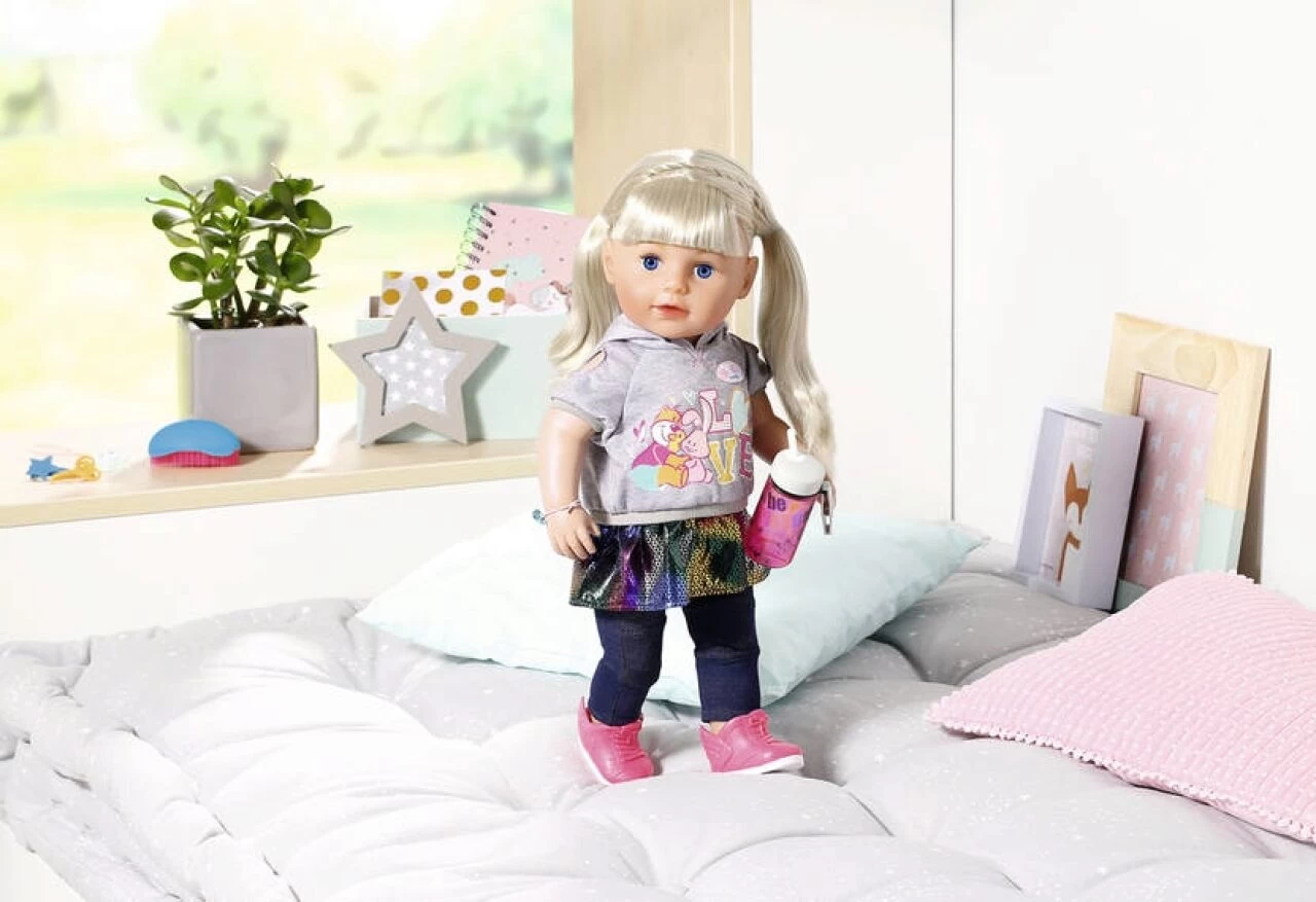 BABY born Soft Touch Sister blond 43cm mit Shirt, Leggings und Schuhen. Inklusive Flasche, Haarbürste, 2 Spiralgummis, 4 Haarclips und je 1 Freundschaftsbändchen für Kind und Puppe.