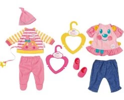 My Little BABY born® Freitzeit Kleidung. Design 1aus Hose, Shirt mit angenähtem Schnuller und Mütze. Design 2 mit Jeans, Kleidchen und Schuhen. Inklusive farblich passender Kleiderbügel.