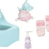 Mit dem Dirndl von Zapf Creation macht BABY born gerne Urlaub in den Bergen. Auf den Almen blühen immer so wunderschöne Blumen. Die kleinen Alpenveilchen sind auf das weiße Oberteil und den grünen Rock des Dirndlkleides gedruckt. Das Kleidchen hat putzige Ärmel aus Spitze und eine angenähte rosa Schürze mit grüner Schleife. Der Kopf der kleinen Bergfreundin wird mit einem Haarband mit Alpenrose geschmückt. Passend dazu trägt BABY born grüne Sandalen