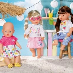 BABY born Holiday Modeset Frühling 43cm aus Kleid, Longsleeve, Shirt, Hose, Rock, Schuhen, Sonnenbrille, sowie Armband und Kette für die Puppe.