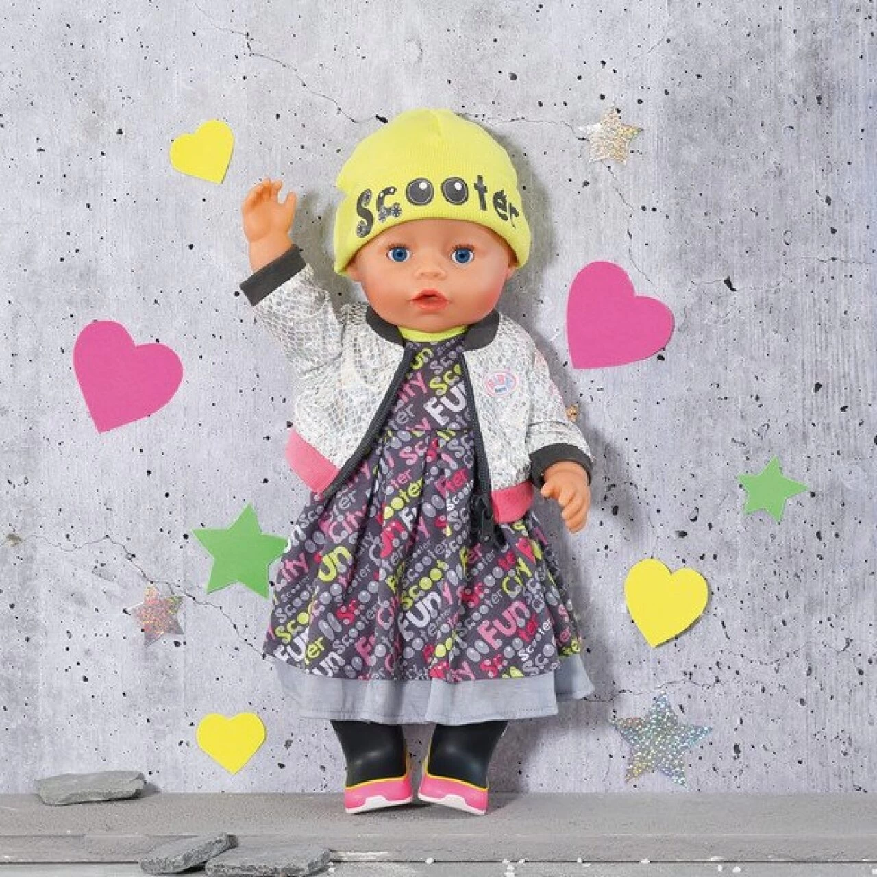 BABY born City Deluxe Style 43cm aus Kleid, Jacke, MĂĽtze und Stiefeln.