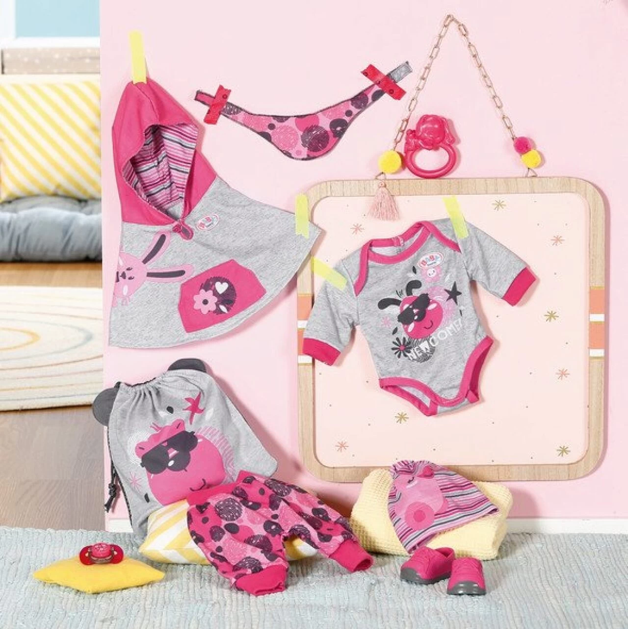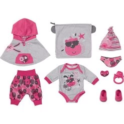 Das Set beinhaltet einen grauen Body mit rosa BĂĽndchen und eine Hose mit verspieltem Muster. Passend dazu gibt es pinke Schuhe. Wenn es etwas kälter ist, bekommt BABY born den Poncho mit Kapuze ĂĽbergezogen. Vielleicht vorsichtshalber auch noch das MĂĽtzchen aufsetzten und das Dreieckstuch um den Hals binden.Â