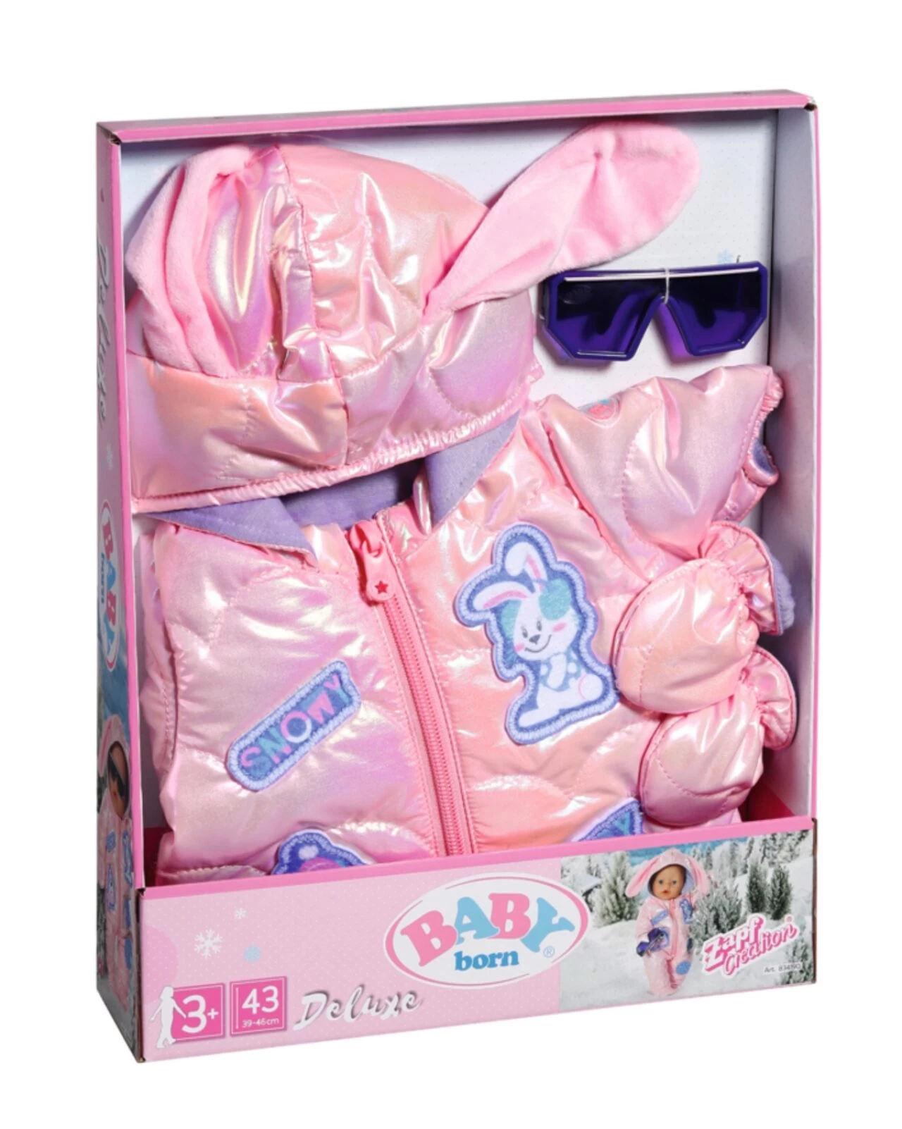 BABY born Deluxe Schneeanzug 43cm aus Onesie, Handschuhen und Brille.