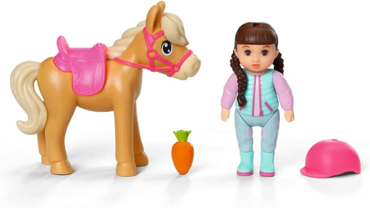 Die 7 cm groĂźe Mini Puppe Kim mit ihrem Pferdchen ist das ideale Geschenk fĂĽr Kinder ab 3 Jahren. Der Kopf sowie die Arme und Beine sind beweglich.