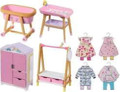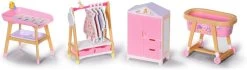 Das Möbel Spielset für die BABY born Minis enthält den bekannten BABY born Kleiderschrank sowie die BABY born Kleiderstange. 4 Deko-Kleider für die Kleiderstange sind ebenfalls enthalten.