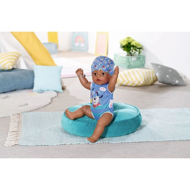 Schlafen, Baden und Essen sind des Boys Lieblingsbeschäftigungen. Er trinkt gerne Wasser aus seinem Fläschchen und kann dann Pipi in die Windel oder ins Töpfchen machen und echte Puppentränen weinen. Neben Wasser steht der BABY born Brei auf dem Speiseplan. Dann macht er sogar sein großes Geschäft. Seine Arme, Beine und der Kopf sind super beweglich, so dass das An- und Ausziehen der coolen Kleidung zum Kinderspiel wird. Der Soft Touch Körper ist angenehm weich.